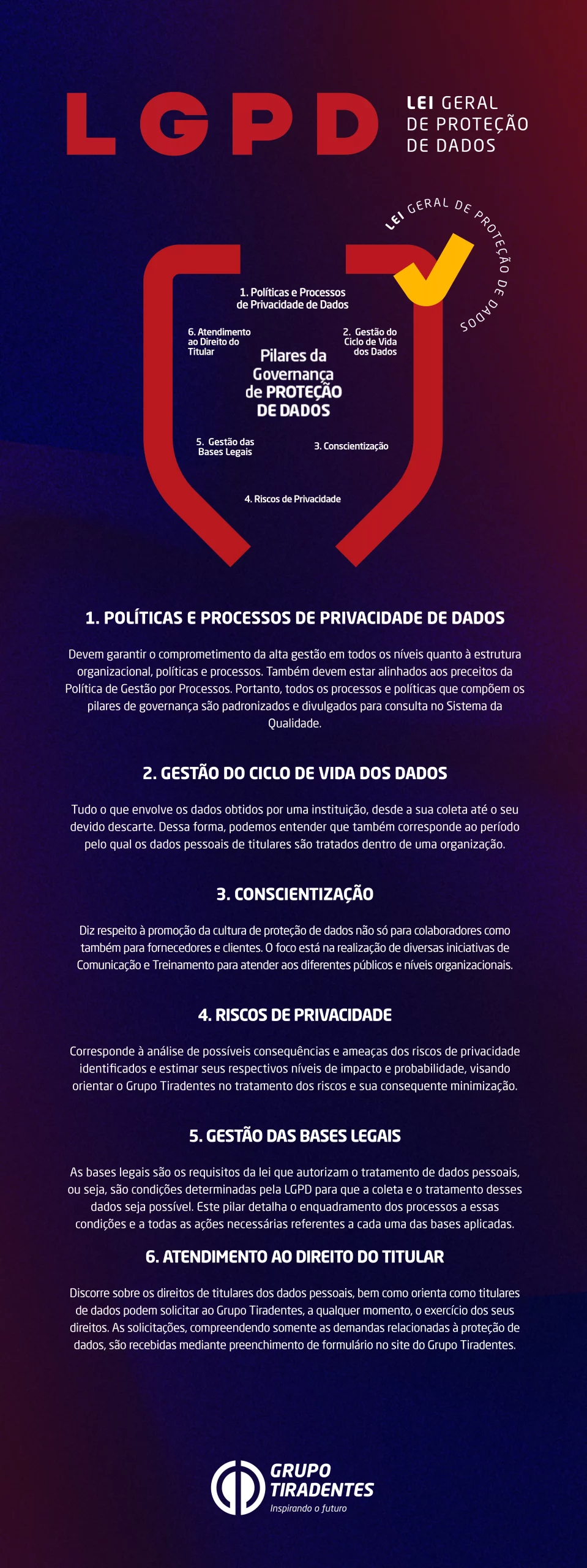 - Encarregado - Também chamado de Data Protection Officer (DPO), o Encarregado pela Proteção de Dados é uma pessoa indicada pelo Controlador/Operador para agir como canal de comunicação entre o Controlador e os titulares de dados, e entre o Controlador e a Autoridade Nacional de Proteção de Dados (ANPD). Aqui no Grupo Tiradentes a Gerência de Proteção de Dados é quem faz o papel do Encarregado.