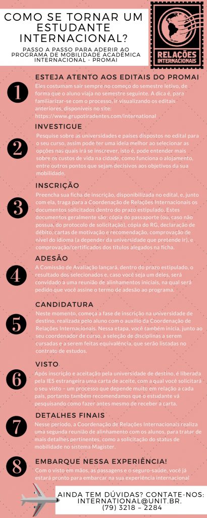 Realizado anualmente, todo o processo de seleção e aprovação é realizado pelo Grupo Tiradentes, por meio da Coordenação de Relações Internacionais. Portanto, se está interessado em aproveitar essa oportunidade de vivência internacional, fique atento ao lançamento do edital que, geralmente, acontece entre os meses de março e abril.